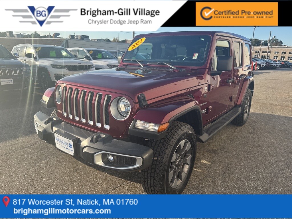 Recent Arrival! Brigham-Gill Village CDJR is proud to present you with another True Market Priced Pre-Owned Vehicle. This 2021 Jeep Wrangler Unlimited Sahara FCA US LLC Certified Pre-Owned is loaded with the following Factory Options: Cold Weather Group (Heated Front Seats and Heated Steering Wheel), Quick Order Package 22G, Safety Group (Blind Spot & Cross Path Detection and ParkSense Rear Park Assist System), Apple CarPlay/Android Auto, Cloth Low-Back Bucket Seats, Front Center Armrest w/Storage, Front License Plate Bracket, Google Android Auto, Heated door mirrors, Leather steering wheel, ParkView Rear Back-Up Camera, Passenger door bin, Power door mirrors, Power Top Quarter Window Storage Bag, Radio: Uconnect 4 w/7" Display, Remote keyless entry, Remote Proximity Keyless Entry, Remote Start System, Removable Rear Quarter Windows, Sky 1-Touch Power Top, Steering wheel mounted audio controls, and Wheels: 18" x 7.5" Tech Gray Machined Face Cold Weather Group (Heated Front Seats and Heated Steering Wheel), Quick Order Package 22G, Safety Group (Blind Spot & Cross Path Detection and ParkSense Rear Park Assist System), FCA US LLC Certified Pre-Owned Certified, Apple CarPlay/Android Auto, Cloth Low-Back Bucket Seats, Front Center Armrest w/Storage, Front License Plate Bracket, Google Android Auto, Heated door mirrors, Leather steering wheel, ParkView Rear Back-Up Camera, Passenger door bin, Power door mirrors, Power Top Quarter Window Storage Bag, Radio: Uconnect 4 w/7" Display, Remote keyless entry, Remote Proximity Keyless Entry, Remote Start System, Removable Rear Quarter Windows, Sky 1-Touch Power Top, Steering wheel mounted audio controls, Wheels: 18" x 7.5" Tech Gray Machined Face, 3.45 Rear Axle Ratio, 4-Wheel Disc Brakes, 8 Speakers, ABS brakes, Air Conditioning, Alloy wheels, AM/FM radio: SiriusXM, Anti-Spin Differential Rear Axle, Apple CarPlay, Automatic temperature control, Aux Battery, Brake assist, Compass, Delay-off headlights, Driver door bin, Driver vanity mirror, Dual front impact airbags, Dual front side impact airbags, Electronic Stability Control, Front anti-roll bar, Front Bucket Seats, Front dual zone A/C, Front fog lights, Front reading lights, Fully automatic headlights, Garage door transmitter, GPS Antenna Input, Heavy Duty Suspension w/Gas Shocks, Illuminated entry, Integrated roll-over protection, Integrated Voice Command w/Bluetooth, Low tire pressure warning, Manufacturer's Statement of Origin, Non-Lock Fuel Cap w/o Discriminator, Occupant sensing airbag, Outside temperature display, Panic alarm, Passenger vanity mirror, Power steering, Power windows, Radio data system, Rear anti-roll bar, Rear reading lights, Security system, Speed control, Split folding rear seat, Stop-Start Dual Battery System, Tachometer, Telescoping steering wheel, Tilt steering wheel, Traction control, Trip computer, Variably intermittent wipers, Voltmeter, and Wheels: 18" x 7.5" Polished w/Gray Spokes!! CLEAN CARFAX/ACCIDENT-FREE HISTORY REPORT, ONE OWNER, BLUETOOTH/HANDS FREE CELL PHONE SYSTEM, JEEP FACTORY CERTIFIED, 4X4, Apple CarPlay/Android Auto, Blind Spot & Cross Path Detection, Cloth Low-Back Bucket Seats, Cold Weather Group, Front Center Armrest w/Storage, Front License Plate Bracket, Google Android Auto, Heated door mirrors, Heated Front Seats, Heated Steering Wheel, Leather steering wheel, ParkSense Rear Park Assist System, ParkView Rear Back-Up Camera, Passenger door bin, Power door mirrors, Power Top Quarter Window Storage Bag, Quick Order Package 22G, Radio: Uconnect 4 w/7" Display, Remote keyless entry, Remote Proximity Keyless Entry, Remote Start System, Removable Rear Quarter Windows, Safety Group, Sky 1-Touch Power Top, Steering wheel mounted audio controls, Wheels: 18" x 7.5" Tech Gray Machined Face.